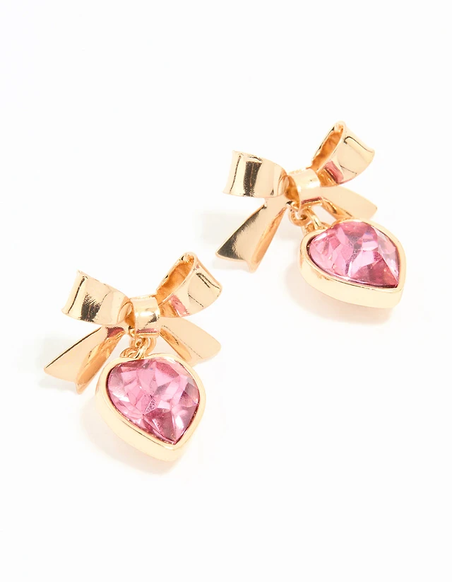 Gold Pink Diamante Heart & Bow Drop Earrings