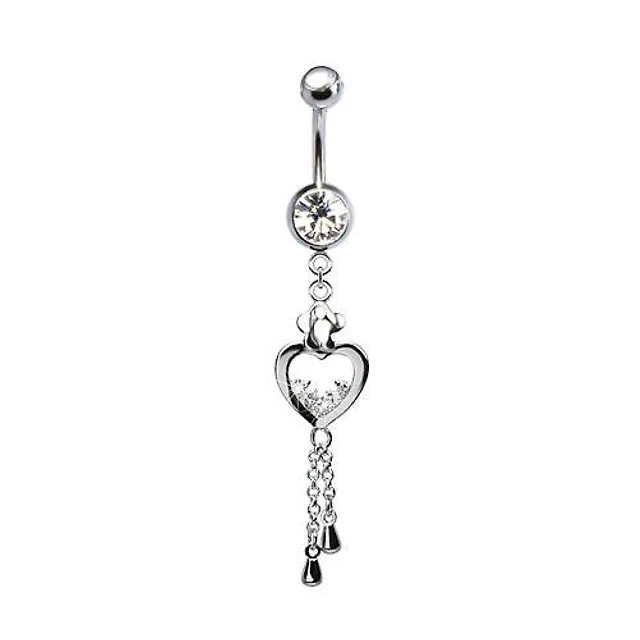316L Surgical Steel Diamond Lined Heart with Butterfly Top & Chain Dangle Belly Ring