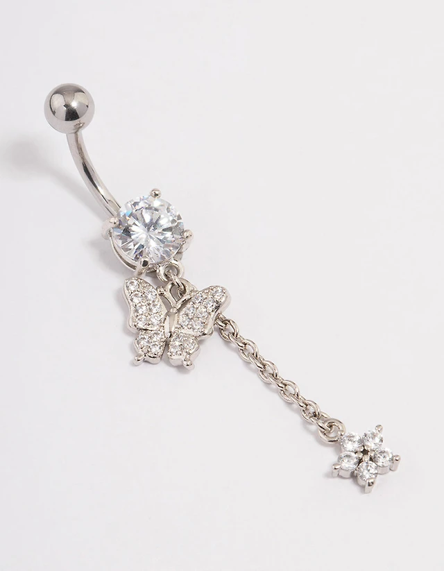 Surgical Steel Cubic Zirconia Butterfly Chain Belly Ring