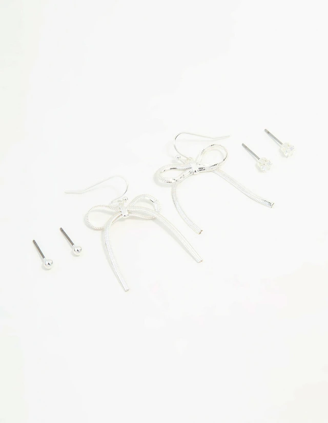 Silver Sleek Ball, Diamante & Bow Earrings 3-Pack