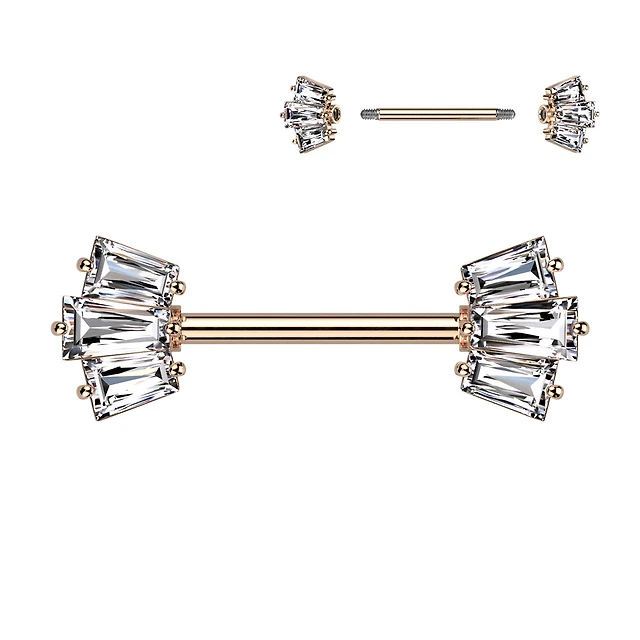 316L Surgical Steel Gold PVD White CZ Triple Baguette Cut Gem Nipple Ring Barbell