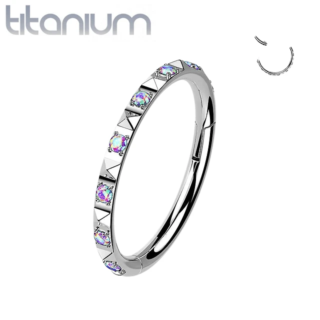 Implant Grade Titanium Ridged With Aurora Borealis CZ Gems Hinged Hoop Clicker Ring