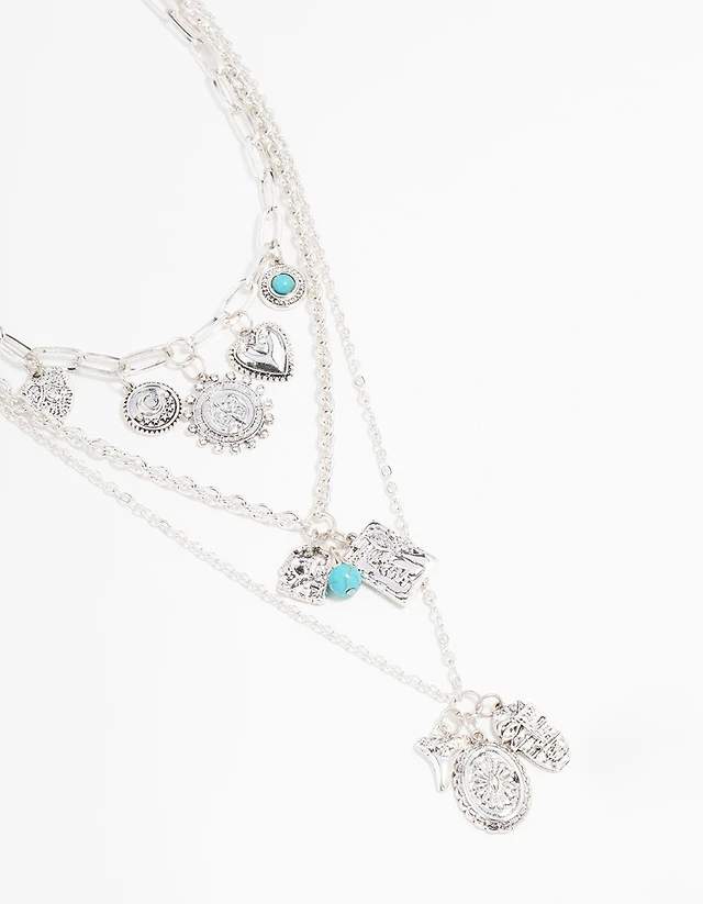 Antique Silver Turquoise & Heart Charm Layered Necklace