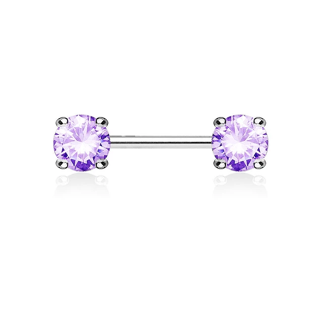 316L Surgical Steel Prong Double Round Purple CZ Nipple Ring Barbell
