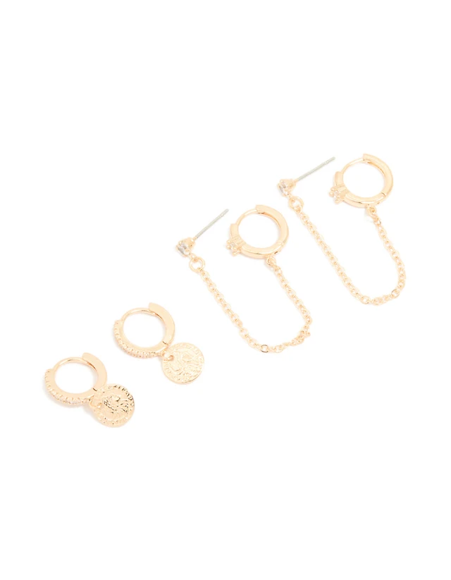 Gold Cubic Zirconia Molten Huggies & Chain Earrings 3-Pack