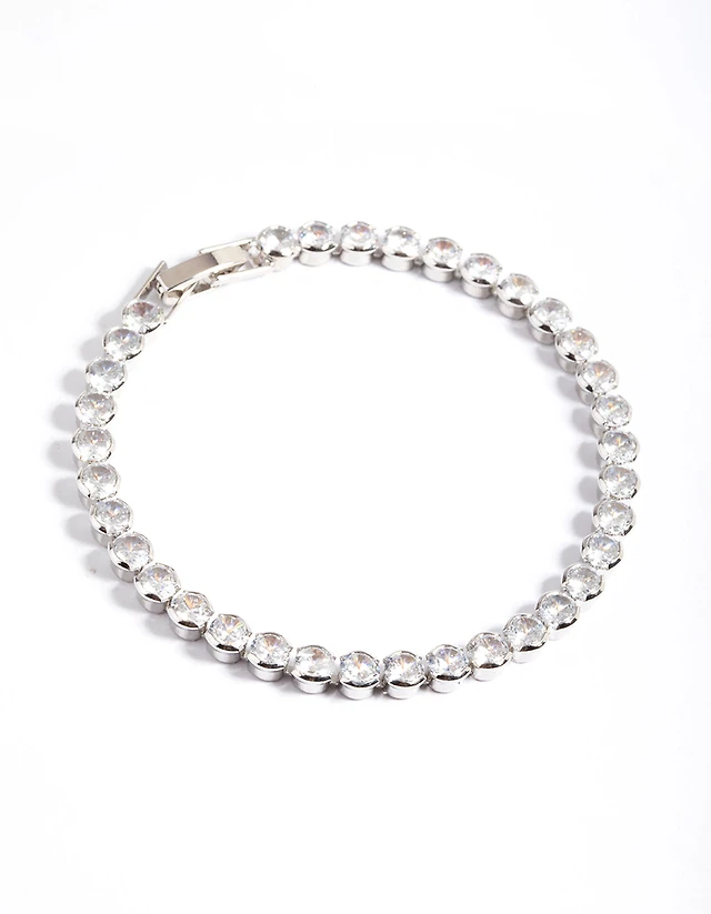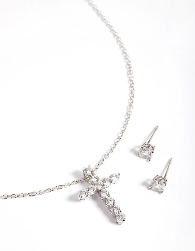 Rhodium Diamond Simulant Stud & Cross Necklace Set