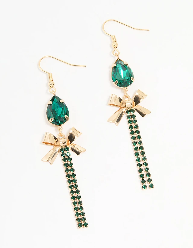 Gold Diamante Cup Chain Bow Drop Earrings
