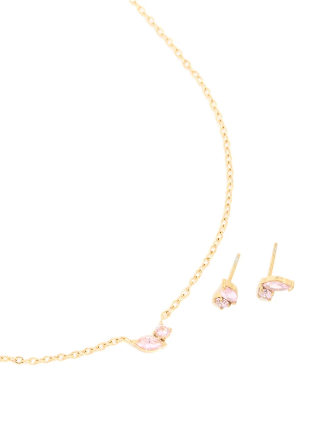 Waterproof Gold Plated Stainless Steel March Blue Cubic Zirconia Birthstone Necklace & Earrings Set