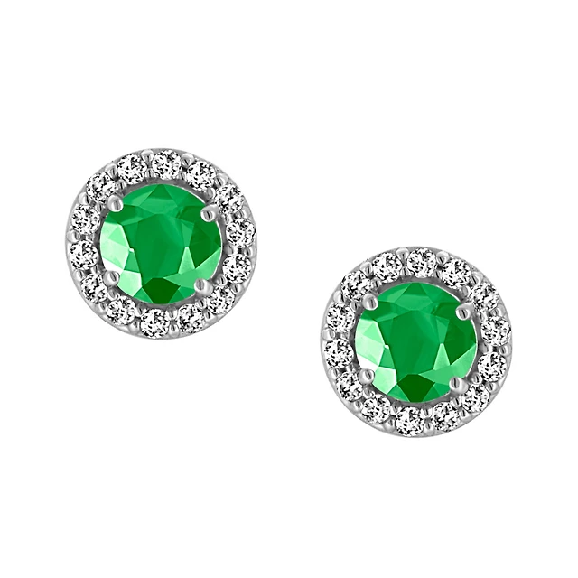 Emerald Cut Green Created Emerald Gemstone and Diamond Halo Earrings in 10kt Yellow Gold