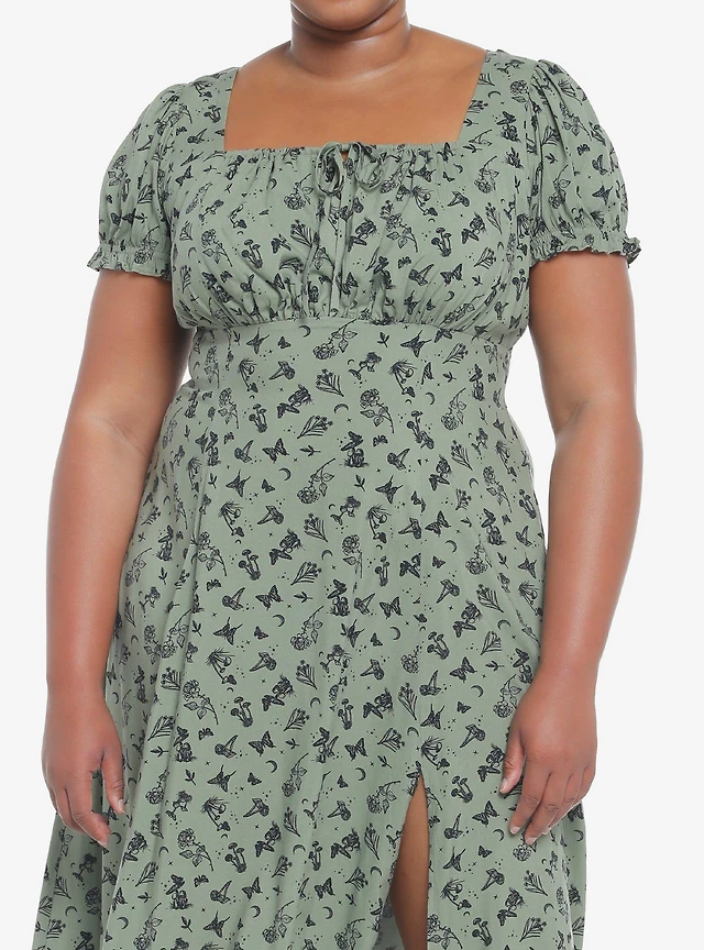 Green Butterfly Mushroom Empire Midi Dress Plus Size