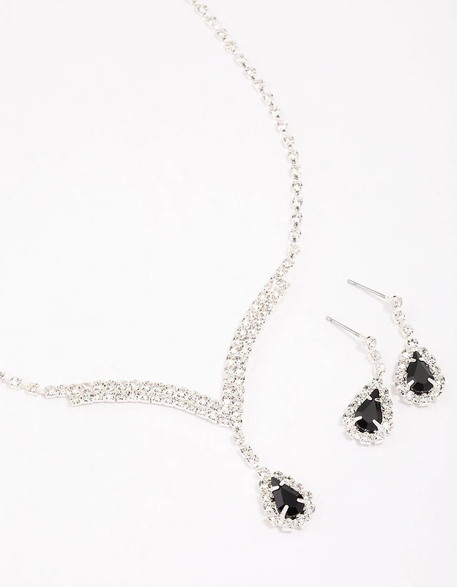 Silver Diamante Stone Long Earrings & Necklace Set