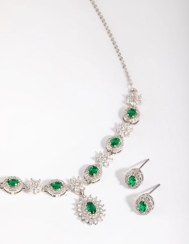 Silver Emerald Diamond Simulant Necklace & Earring Set