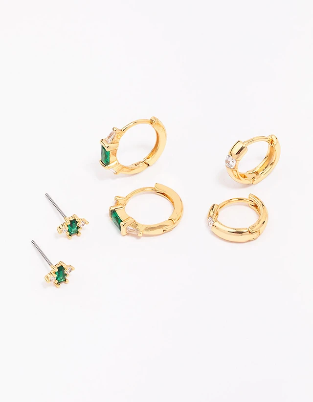 Gold Emerald & Clear Cubic Zirconia Huggie Earrings 3-Pack