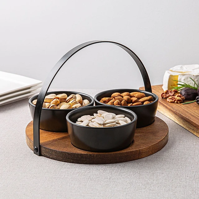KSP Acacia Tray with Ceramic Bowls - Set of 4 22cm dia. x 15cm (Black)