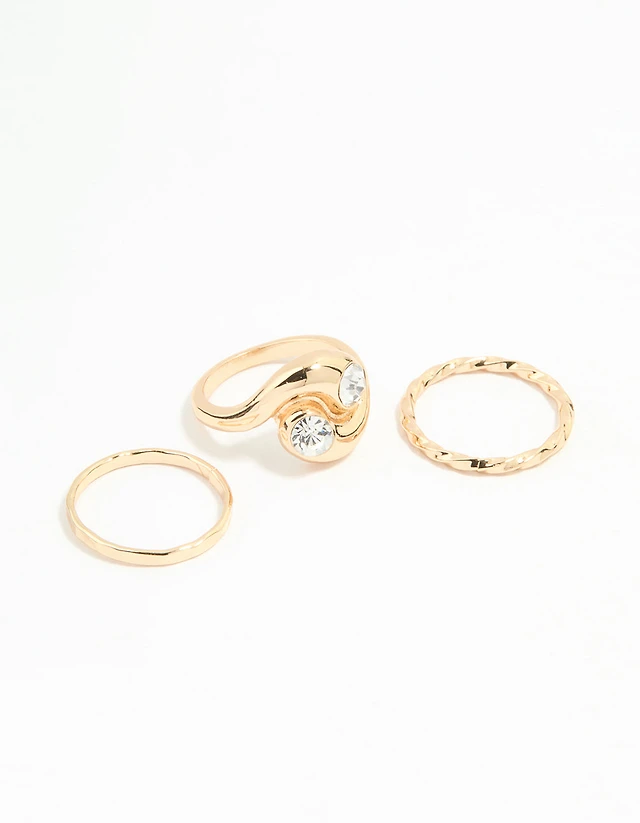 Gold Thick Diamante Twisted Stacking Rings 3-Pack