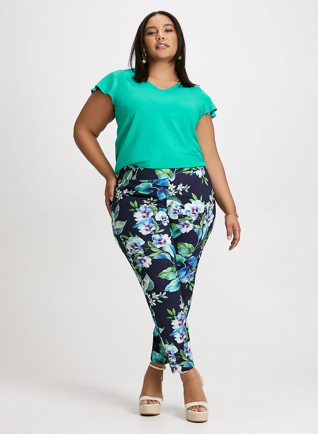 Ruched Detail Cap Sleeve T-Shirt & Pull-On Floral Ankle Pants