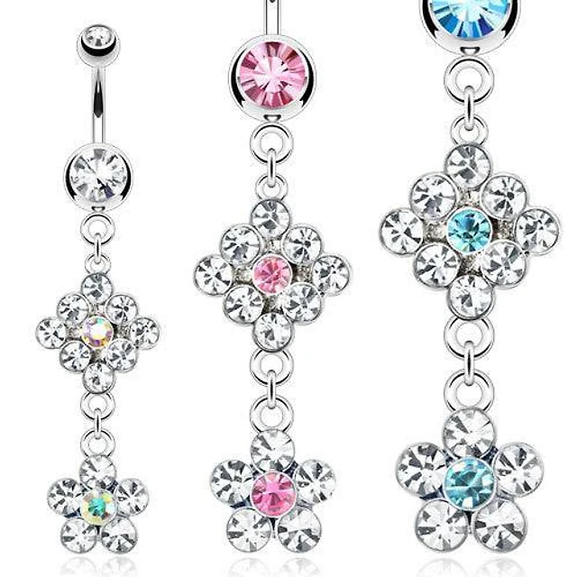 316L Surgical Steel Double CZ Flower Dangling Belly Button Ring