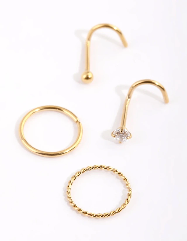 Gold Plated Surgical Steel Diamante Twisted Nose Ring 4-Pack