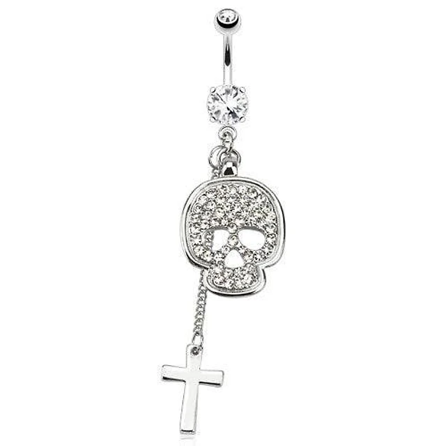 White Studded Gems on Dangle Skull with Cross Belly Button Navel Ring