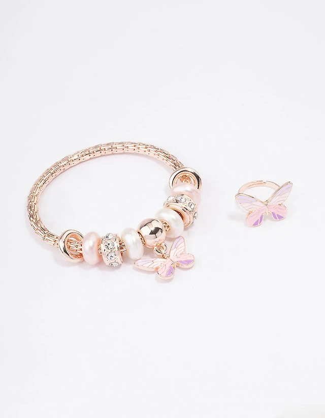Kids Rose Gold Stretch Glitter Butterfly Bracelet & Ring Set