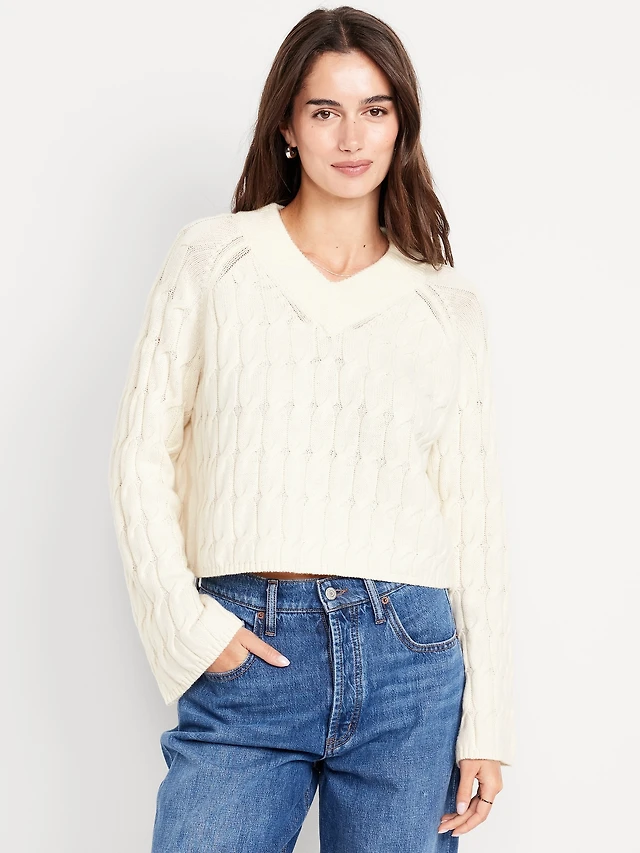 Wool-Blend V-Neck Cable Cropped Sweater