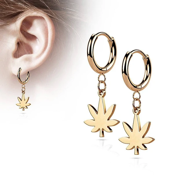 Pair Of 316L Surgical Steel Rose Gold PVD Thin Hoop Earrings With Dangling Weed Leaf