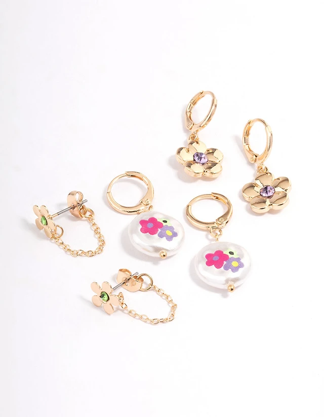 Gold Plated Brass Pearl Drop Flower Earrings 6-Pack