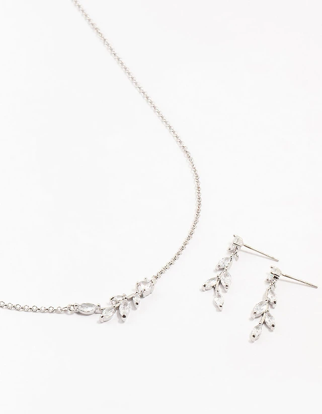 Sideways Pear-Shaped Blue and White Lab-Created Sapphire Frame Bead Station Necklace and Earrings Set in Sterling Silver