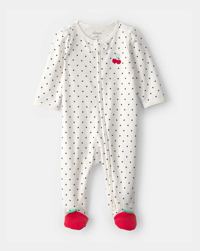 Baby Girl Cherry 2-Way Zip 100% Cotton Sleeper - White