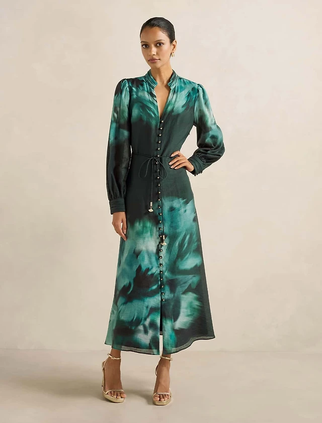 Beechers Brook Floral Belted Short Sleeve Midi Dress - Olive