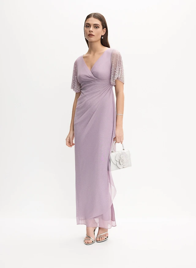 *Daliana Bronze Sequins Ruched Queen Anne Feather Hem Dress