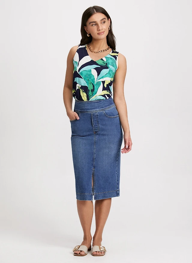 Tropical Print V-Neck Tank Top & Slit-Hem Denim Midi Skirt