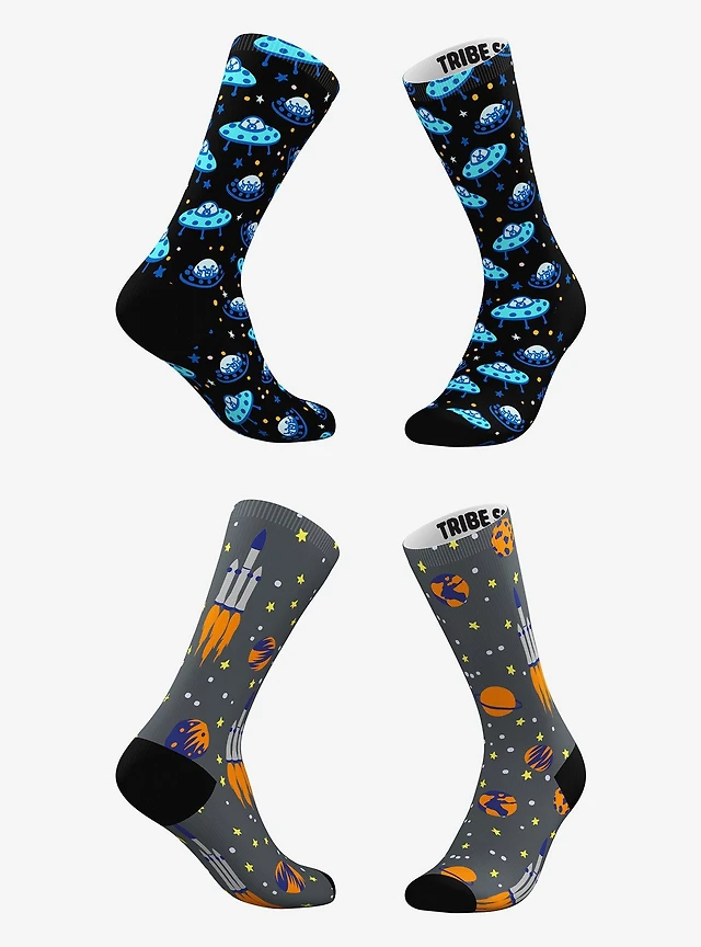Blue Ufo Alien And Grey Rocket Ship Socks 2 Pair