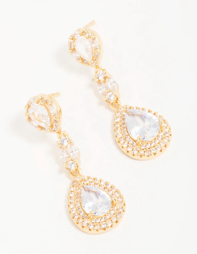 Gold Cubic Zirconia Halo Pear Drop Earrings