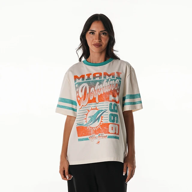 Women's Mitchell & Ness Cream Miami Dolphins Logo Rise Boyfriend T-Shirt