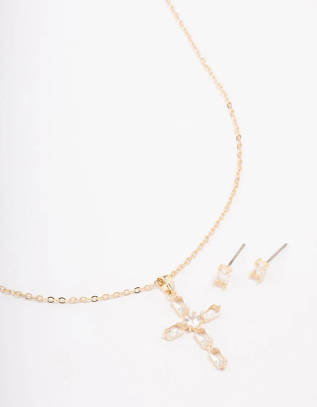 Gold Cubic Zirconia Solitaire Necklace & Stud Earrings Set