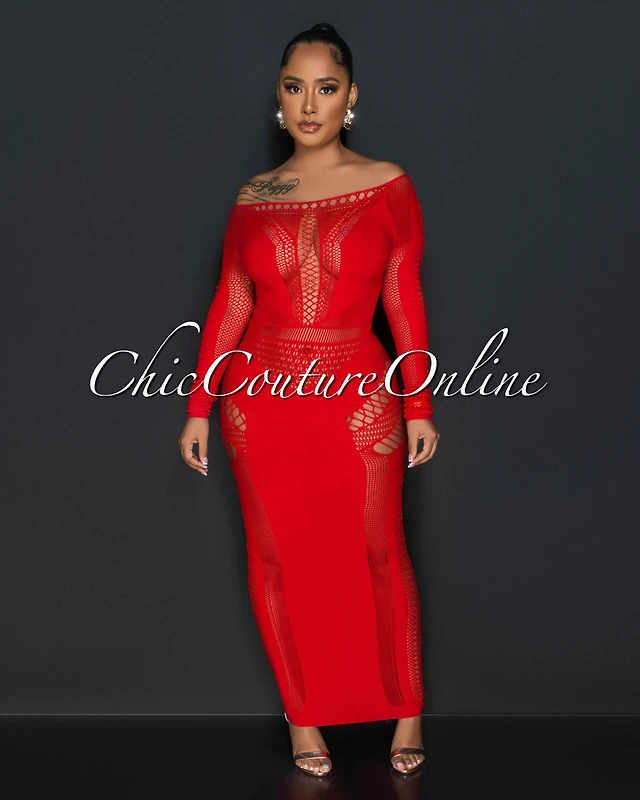 Rosnie Red Mesh Perforated Body-Con Maxi Dress