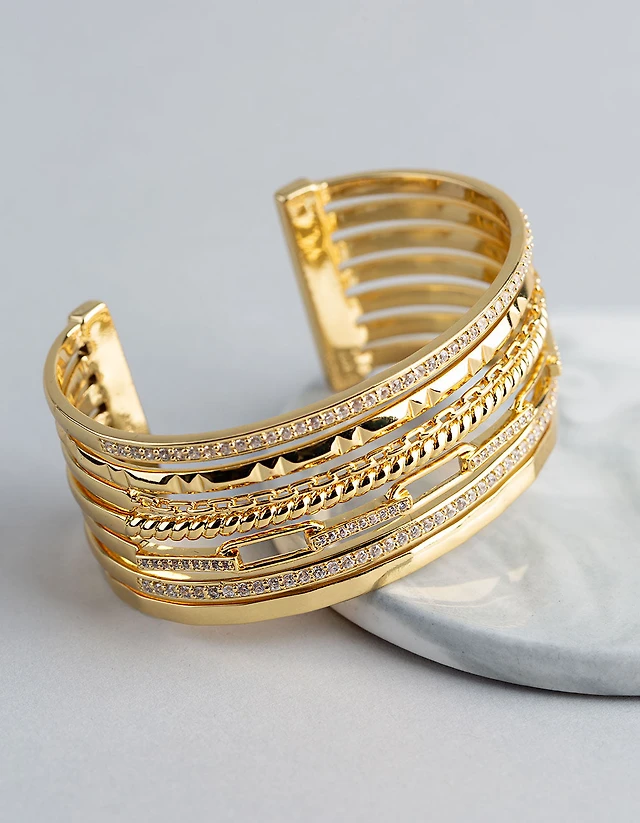 18ct Gold Plated Brass Cubic Zirconia Multi Row Cuff Bracelet
