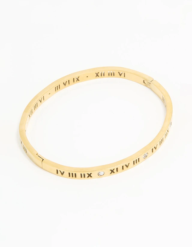 Waterproof Gold Plated Stainless Steel Diamante Roman Numeral Hinge Bangle
