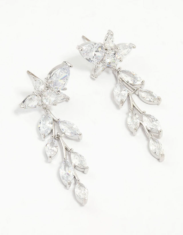 Silver Plated Leaf Pearl Cubic Zirconia Drop Earrings
