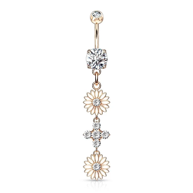 Rose Gold PVD Surgical Steel 3 White CZ Flower Dangle Belly Ring