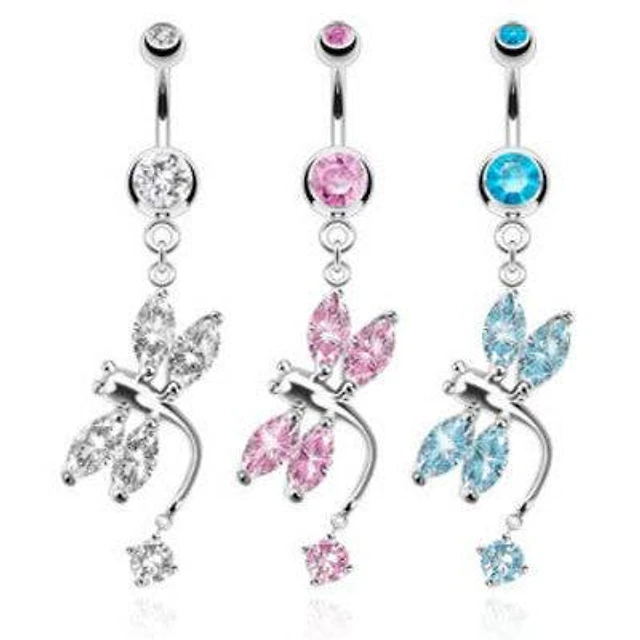 Surgical Steel Belly Button Prong Set CZ Gem Dangling Dragon Fly Ring