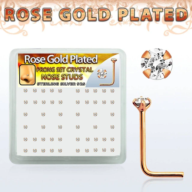 Sterling Silver 18kt Rose Gold Plated 2mm Crystal L Shape Nose Ring Stud