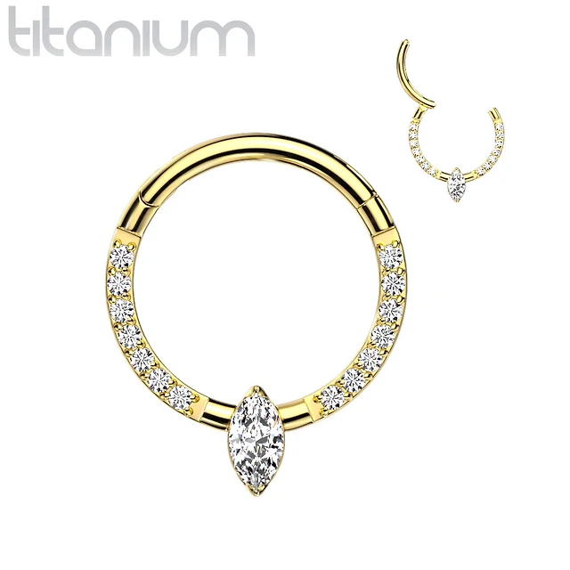Implant Grade Titanium Gold PVD Pave White CZ Marquise Gem Hinged Clicker Hoop