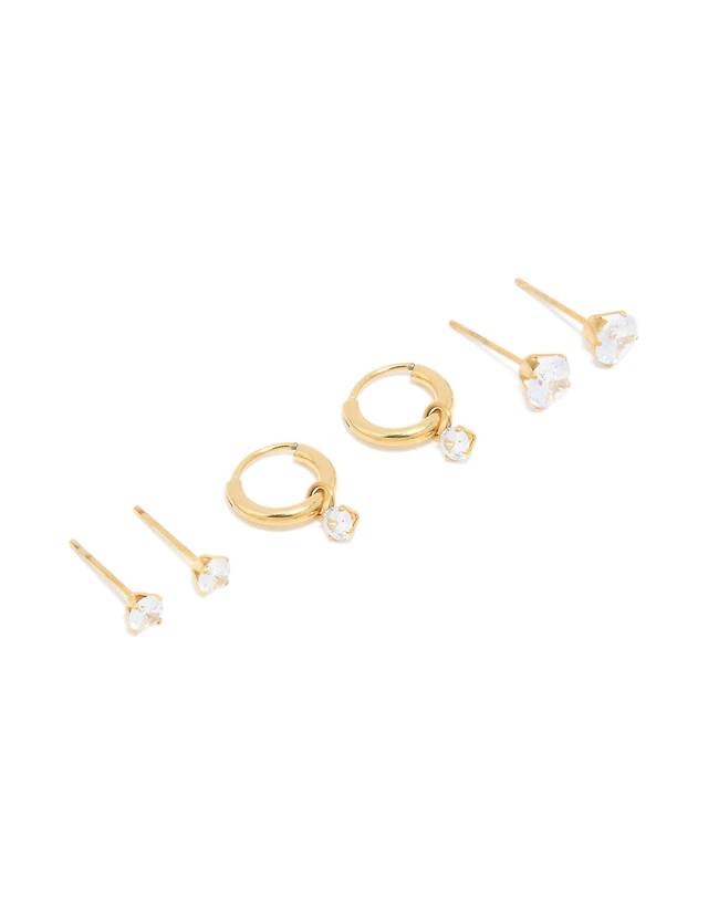 Waterproof Gold Plated Stainless Steel Cubic Zirconia Hoop & Stud Earrings 3-Pack