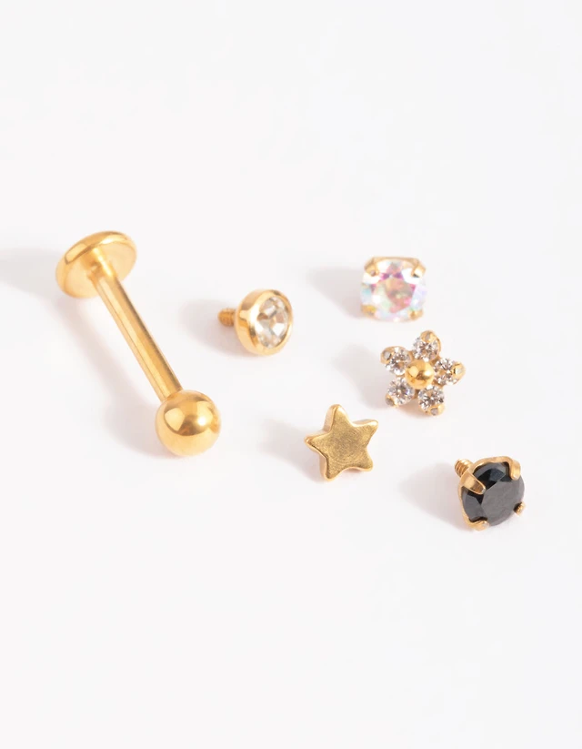 Gold Plated Surgical Steel Single Flat Back Bar & Cubic Zirconia Interchangeable Ends 6-Pack