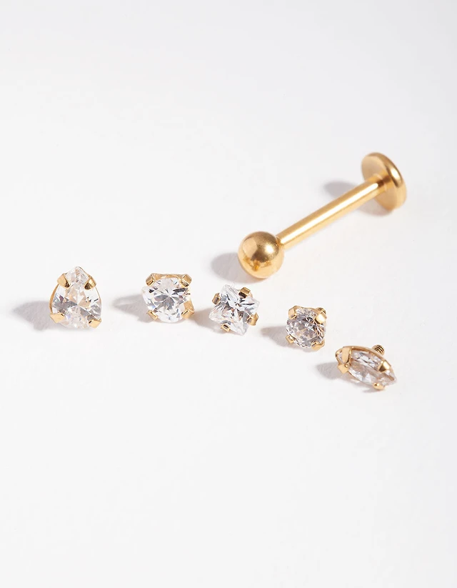 Surgical Steel Single Flat Back Bar & Cubic Zirconia Interchangeable Ends 6-Pack