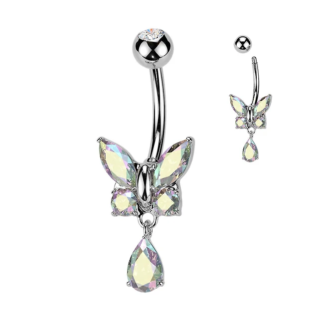 316L Surgical Steel Aurora Borealis CZ Butterfly Tear Drop Dangle Belly Ring