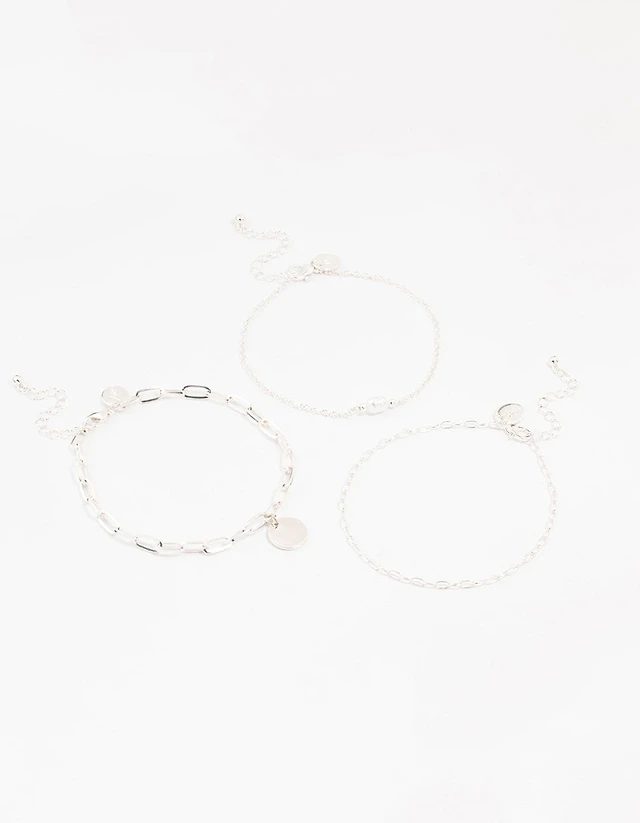 Silver Pearl Disc Drop Anklets 3-Pack