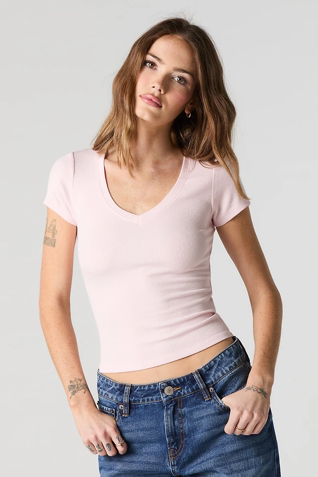 Short Sleeve Coral Crochet V-Neck T-Shirt